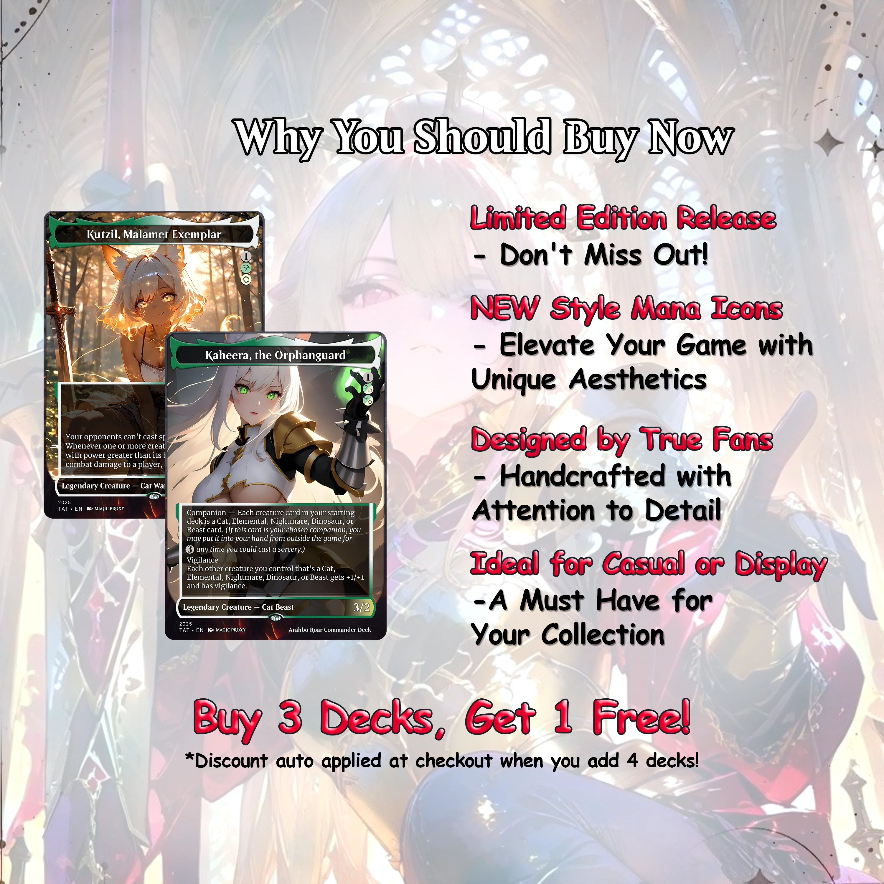 Unleash the elegant might of the feline tribe! This anime-style Arahbo Commander deck is built for high-impact play and irresistible visual appeal. Command the battlefield with buffed Cat creatures, responsive spells, and a pack of beautifully illustrated waifu catgirls.