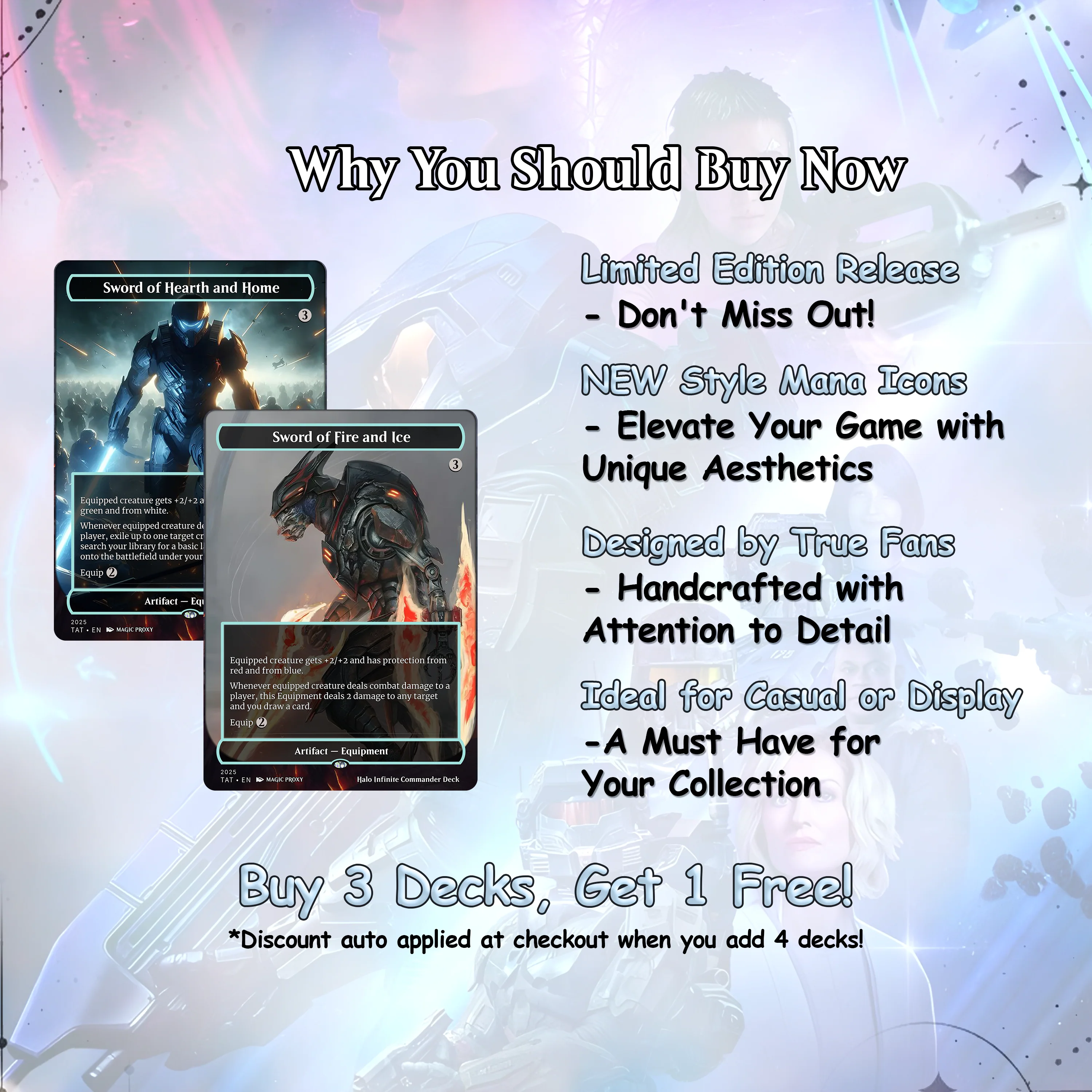 Deploy into battle with this Halo Infinite-inspired Commander deck, where Astor, Bearer of Blades leads a strike force of armored warriors and mechanized vehicles across the galaxy. Every sword forged, every vehicle deployed, every relic equipped — all serve the same purpose: victory through superior technology.