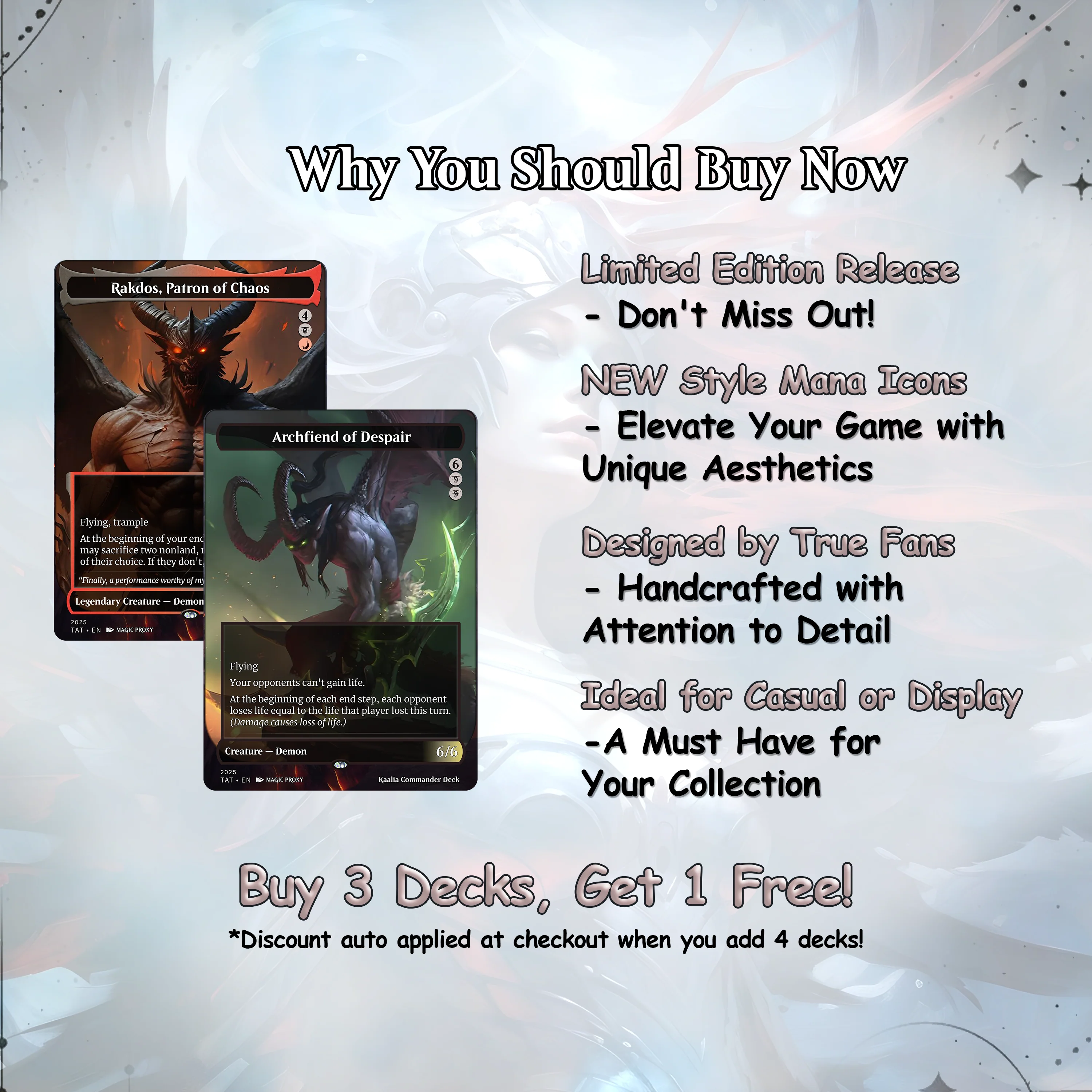 Step into battle with Kaalia of the Vast—your legendary Commander ready to unleash aerial domination. This full proxy EDH deck is built for explosive gameplay, summoning powerful Angels, Demons, and Dragons with Kaalia’s iconic ability. Designed with stunning full-art cards and seamless synergy, this deck is perfect for collectors and casual EDH players.