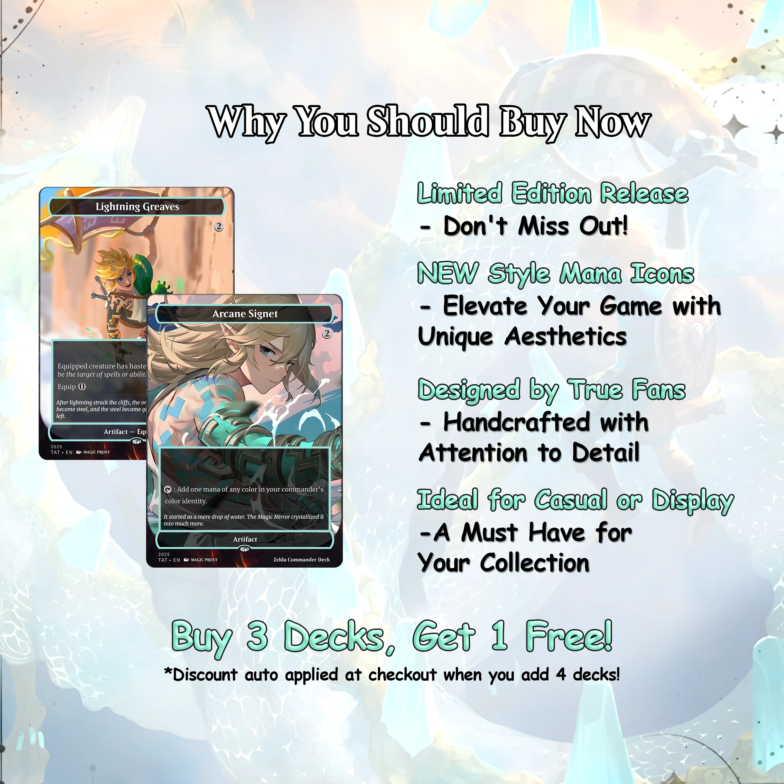 🛡️✨ Gather the champions of every realm and forge your destiny! This Zelda-inspired Commander deck unites the heroes, sages, and divine guardians of Hyrule under Jodah, the Unifier, whose magic binds the world’s legends into one shining force. Each legendary creature becomes a fragment of the Triforce — Power, Wisdom, and Courage — coming together in radiant harmony.